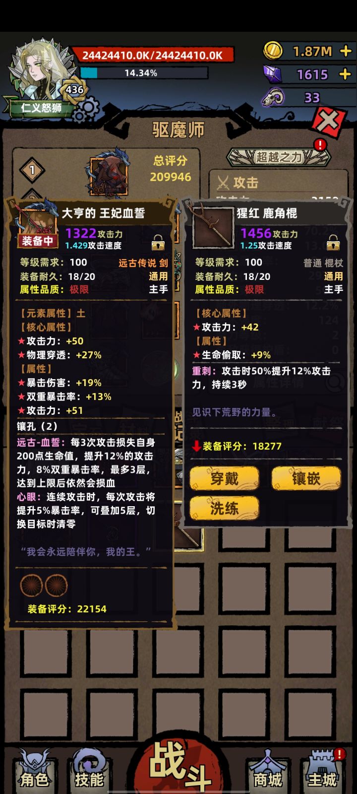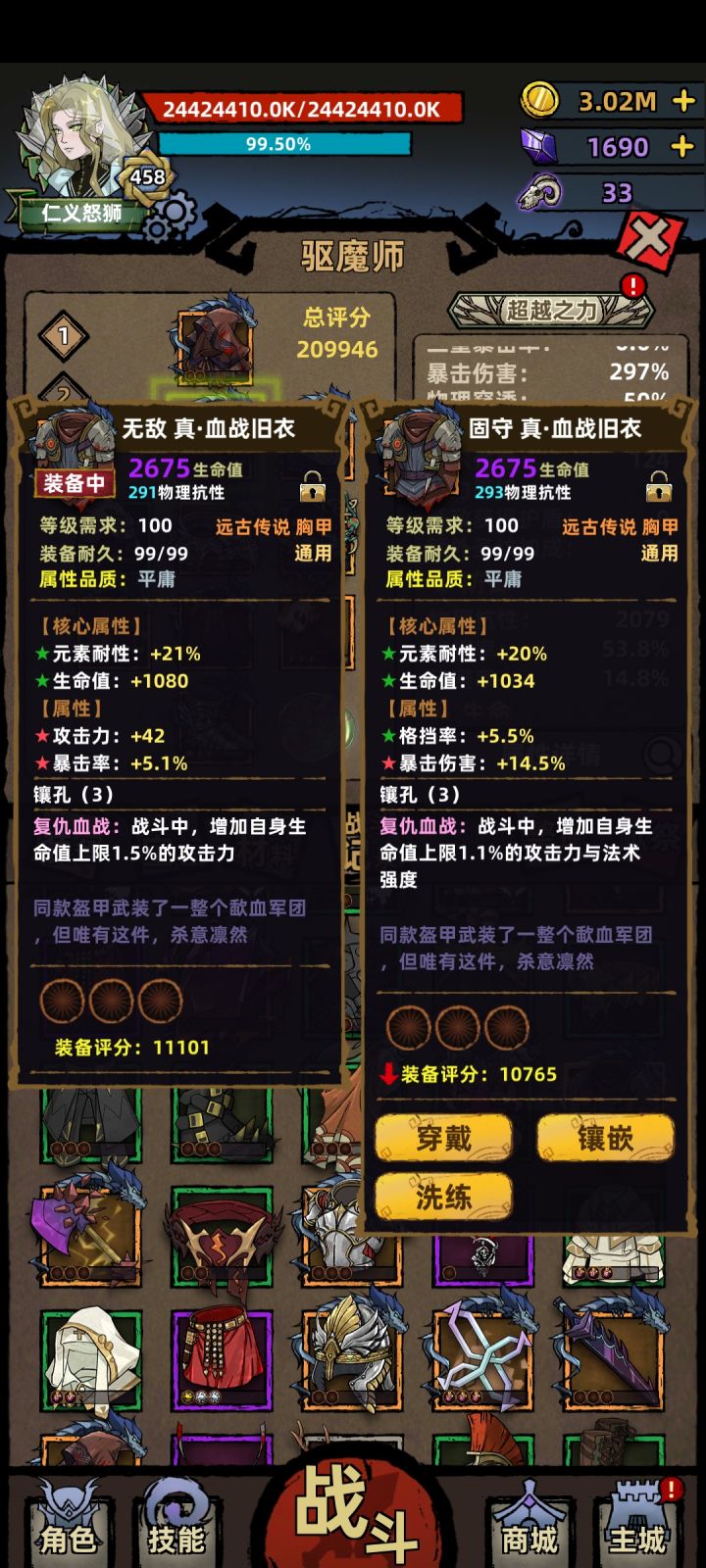超高血量,怪我看我像boss。核心远古血战三件,其它随意。旧衣词条会同时增加攻击和法强,即便装备描述里面没有,所以这个套路全职业通用。面板血量上限21亿,人物血条不是,装备词条计算是是以血条来算。远古圣剑词条的胜利剑可以一用,鹿角棍小玩具。