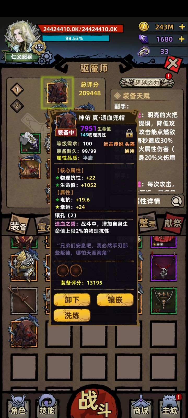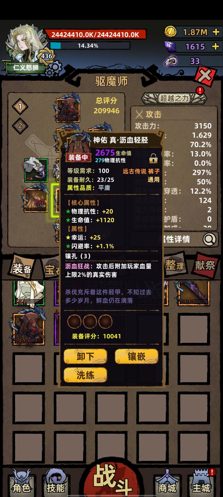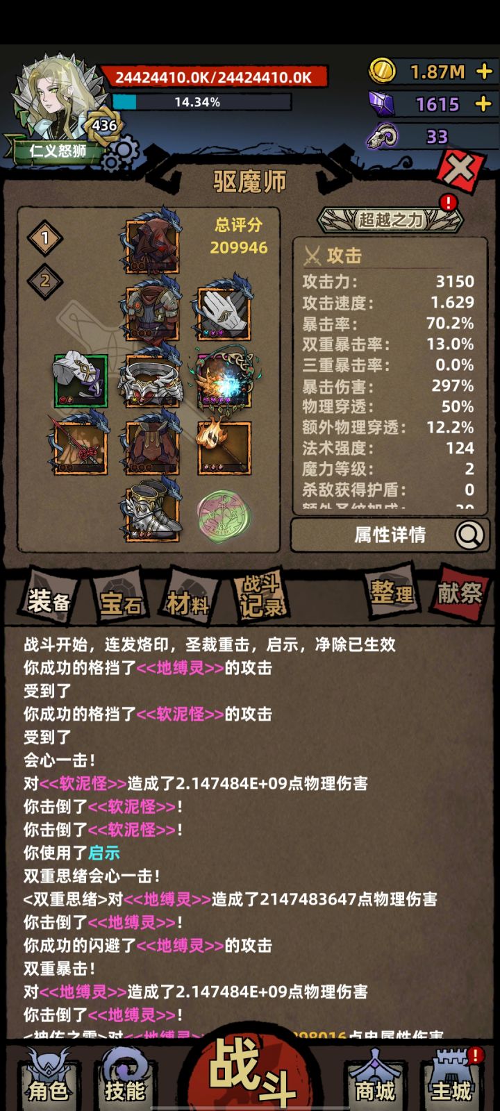 超高血量,怪我看我像boss。核心远古血战三件,其它随意。旧衣词条会同时增加攻击和法强,即便装备描述里面没有,所以这个套路全职业通用。面板血量上限21亿,人物血条不是,装备词条计算是是以血条来算。远古圣剑词条的胜利剑可以一用,鹿角棍小玩具。