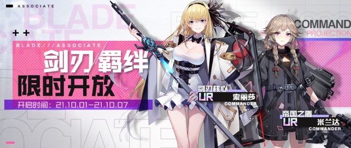 全新坦炮羁绊组合卡池限时开放!~开放时间:2021年10月1日0点开放,10月7日24点关闭限时角色:UR米兰达(坦克)、UR索丽莎(火炮),双方互相激活羁绊【剑与盾】获取方式:本次限定角色需使用专用投影券抽取,司令官可通过游戏内活跃活动以及礼包购买获取米兰达技能展示:索丽莎技能展示: