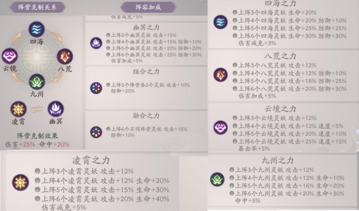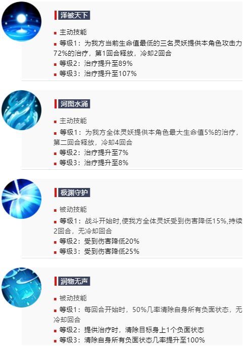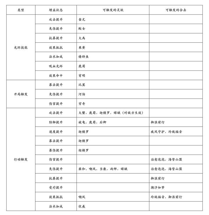 以下是游戏中含有的各种增益状态,根据触发机制将其分为三种类型,光环技能(存在该灵妖增益常驻,该灵妖死亡则增益失效),开局触发(开局无需任何条件即可触发),行动触发(必须使用主动技能才可以触发)。灵妖独有的技能,如蚩尤的狂暴,数斯的盾甲,柏高的酒意,祝融的幽冥鬼火,未列入在内。1. 光环技能和开局触发的增益效果统称为非行动触发,非行动触发的同名增益状态会出现冲突。表现为当一只灵妖同时受到两种状态