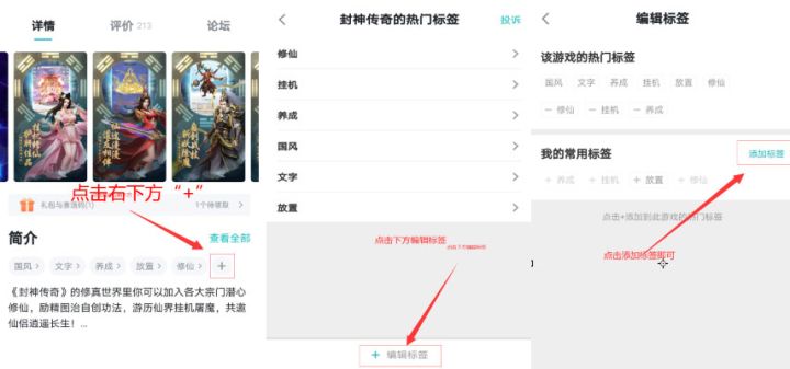 《封神传奇》现开启标签征集活动,希望各位仙友踊跃参与,为封神传奇添加符合游戏特色的标签,参与活动即可领取法宝十连抽!【活动内容】打开封神传奇 TapTap专区,为《封神传奇》专区添加标签,将截图发在本贴下方,并加群私聊管理员即可领取法宝十连抽!!具体操作如图:【标签参考】竖屏、策略、探索、社交、多人、冒险【活动时间】即日起至4月30日【活动奖品】道具奖励:极品法宝袋*10、上品