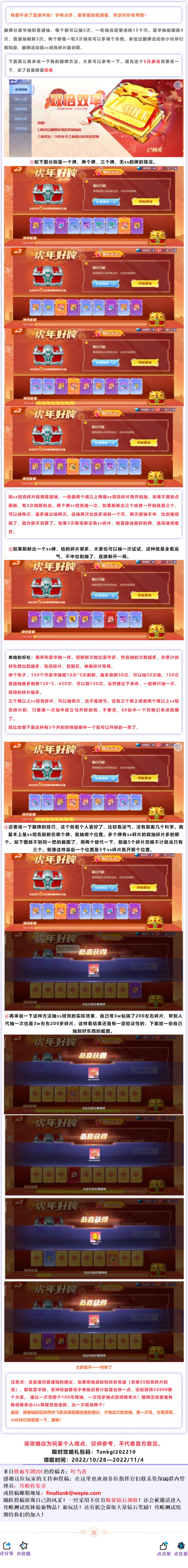 玩了半年多吧,确实有点疲倦了,感觉要出点新意了,毕竟算是比较好的游戏了,真希望朋友常在,坦克无敌 比如闯关刷完部件,体力都不用,可以改成几率掉落驾驶员,坦克碎片。 对战没好坦克都不耍,出个模式,随机坦克一种坦克,或者指定一种坦克。 新开的区次元战场都不出,反映都没渠道。 上次征集坦克,神器,驾驶员,下次可以征集玩法,改进模式