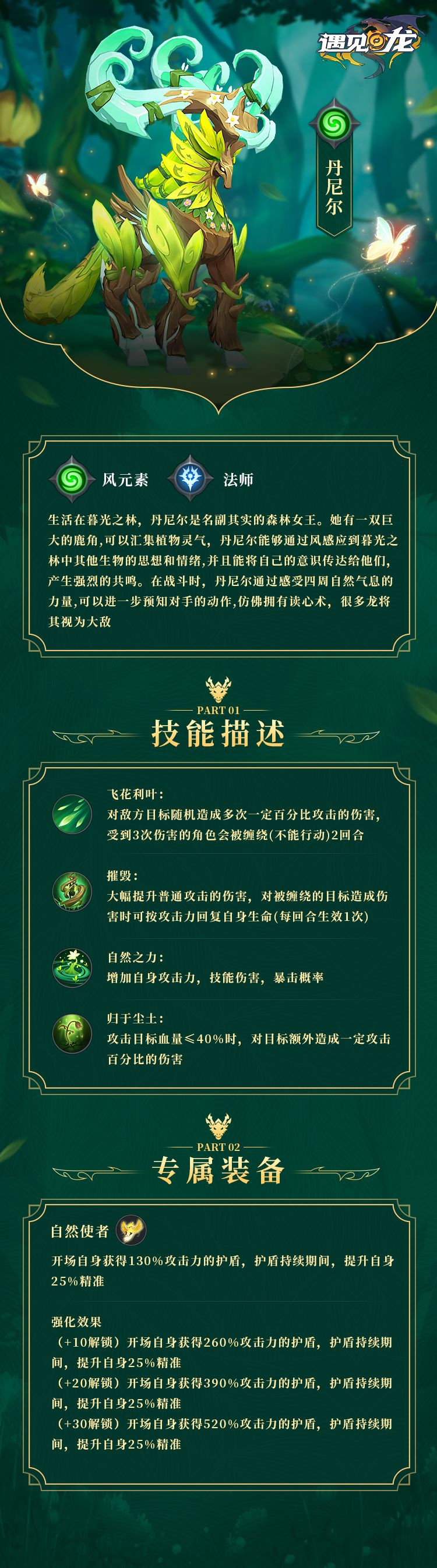 亲爱的驯龙师们,大家好~我是你们的千黎 今天千黎来为大家介绍我们风元素的龙族伙伴——风之女王 丹尼尔 生活在暮光之林的丹尼尔是名副其实的森林女王。她有一双巨大的鹿角,可以汇集植物灵气,丹尼尔能够通过风感应到暮光之林中其他生物的思想和情绪,并且能将自己的意识传达给他们,产生强烈的共鸣 (实际数值以游戏内为准)