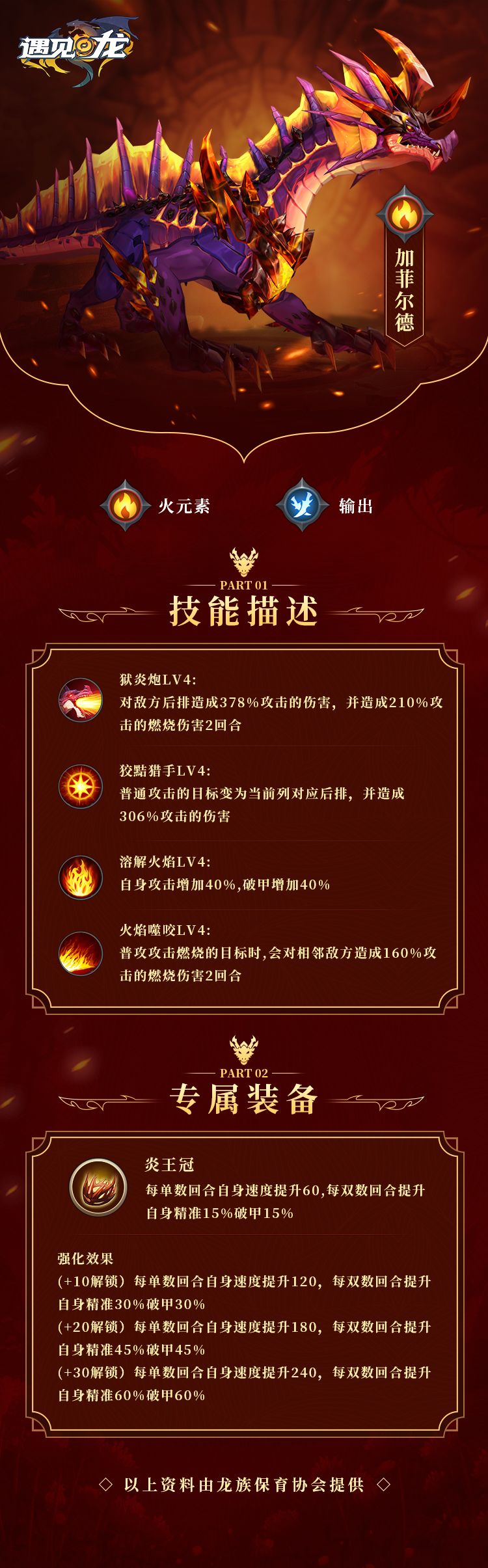 亲爱的驯龙师们,大家好~我是你们的千黎 今天千黎来为大家介绍我们火元素的龙族伙伴——奔行者 加菲尔德 加菲尔德出生在蒸汽峡谷,是火龙中体型最小的龙,与生俱来便和火焰有着紧密关系。加菲尔德爱冒险,四处行走,他是最早穿越迷失之环前往到人类世界的龙,因而人类对龙最早的认知就是喷火以及云雾环绕 (实际数值以游戏内为准)