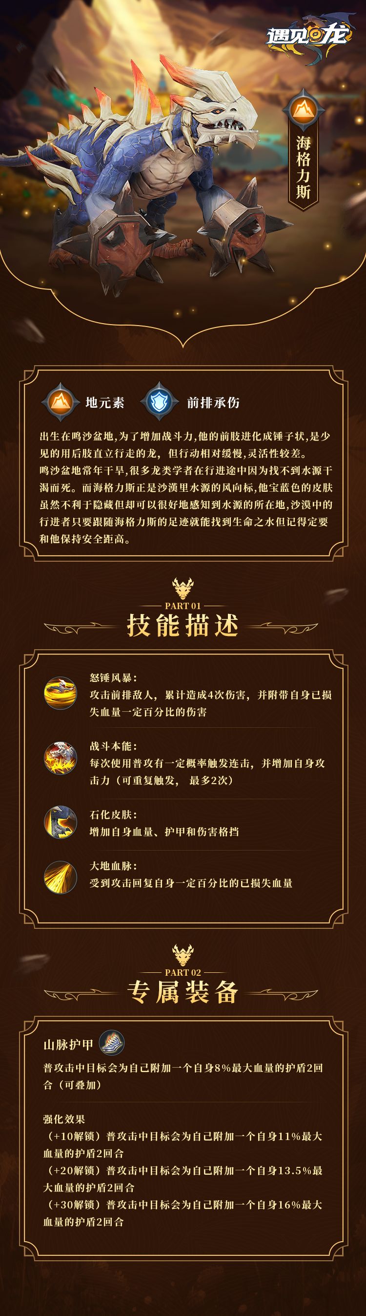 亲爱的驯龙师们,大家好~我是你们的千黎 今天千黎来为大家介绍我们地元素的龙族伙伴——鸣沙领主 海格力斯 鸣沙盆地常年干旱,很多龙类学者在行进途中因为找不到水源干渴而死。而海格力斯正是沙漠里水源的风向标,他宝蓝色的皮肤虽然不利于隐藏但却可以很好地感知到水源的所在地,沙漠中的行进者只要跟随海格力斯的足迹就能找到生命之水。但记得定要和他保持安全距离 (实际数值以游戏内为准)