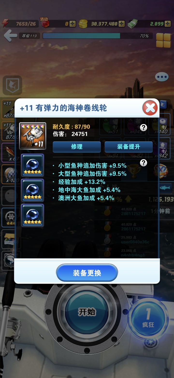 首先声明我这套装备算不上好。五星及以下装备非进化得来的初始等级为7级,这个等级不显示在外面,但是它的伤害和7级装备的伤害是一样的。六星和七星装备不管是咋得来的,等级都外显,等级越低伤害越高,1级最高10级最低。刚才我进化出来一个海神杆,2级,十次明星强化加一次突破极限到+11,伤害就破三万了。正常的成品杆+13伤害才破三万。同级别同套装的杆子和卷线轮在相同强化等级下伤害是一样的,同为+11,伤害差