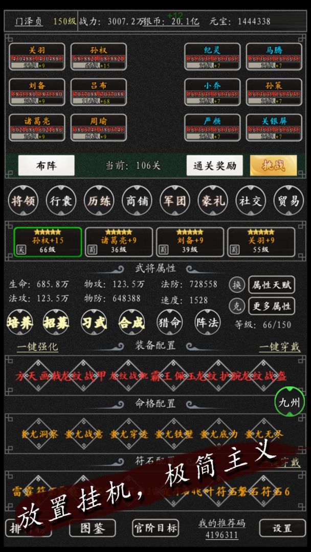 开发者的话游戏以中国古典名著《三国演义》为背景,讲述在三国的乱世中,玩家可扮演主公的角色,招募三国时期的各种名将,来实现三国统一的梦想。游戏拥有招募武将、羁绊、命格、符石等战斗培养元素,还引入PVP竞技场、多人PVE军团副本玩法,还有独创的九州玩法,让你体验不一样的三国。