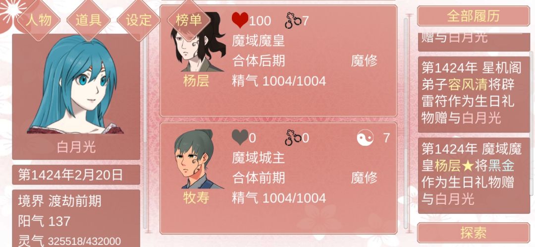 前期不太会玩,于是狂吸元阳给自己的技能升级……然后后面解锁了榜单,一下子被剑尊和妖王迷住(其实还有第一代魔尊……可惜后面渡劫失败陨落),然后开始有目的性地结识万剑山,魔域,还有十万大山的人哈哈哈哈哈哈 不负众望全都结识到了,通通收入后宫。关于这些年遇到的大佬: 1.药王谷谷主:其实前期遇到第一个大佬是药王谷谷主(但是感觉有点丑),据说药王谷的会爆丹药给你,所以就刷了下好感度……然后后面就没理他了。