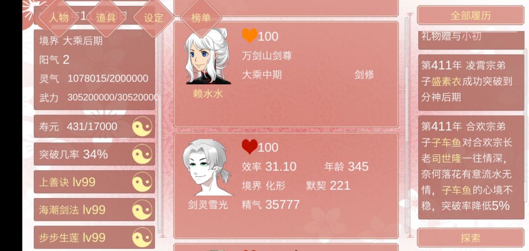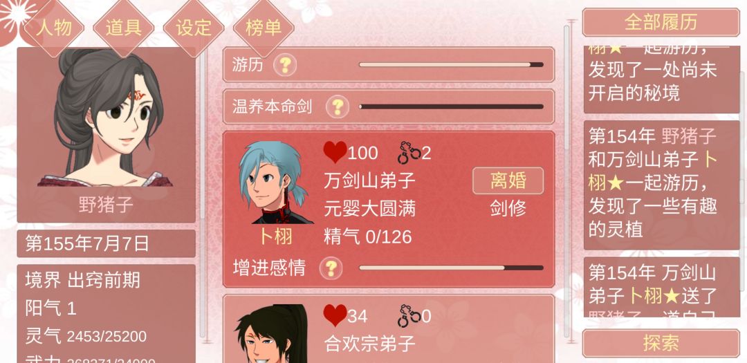 注意:有比较混邪的内容 建议多发展认识药王谷和星机阁的人,前者高亲密概率送突破境界丹,后者概率送避雷丹,在难刷亲密的人里非常有用 多和高地位的鱼相处,会认识更高地位的鱼 多发展高地位的鱼方便保障精气来源,就可以很大程度地把灵草省下来 关于拿下专情且有道侣的鱼,在攒了一堆灵草后给对方道侣狂送灵草,赌渡劫失败,基本渡劫死亡率在10%以上就可以考虑该方案,20%的成功率更高,渡劫失败不算仇杀,专情鱼还是