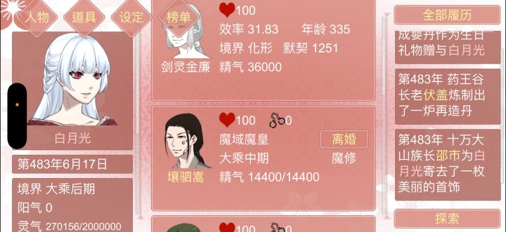 这个女人,玩的比我还野。这个其貌不扬的npc在54年泡走了我十万大山最帅的兔子,我准备当鱼或者种豌豆的兔子啊!!东西不够就没刷准备缓缓的兔子就给她薅了她在66年的时候,救了一个凌霄宗弟子苗蒙,从他此爱上了她,在76年的时候救了一个合欢宗弟子奚绛,从此他也爱上了她。上官明这个女人,在这个时候过上了道侣一个,小鱼两条每天都有人约着出去还有为她伤心落泪,而我在盘隔壁万剑山的一个长老日子很快过去了