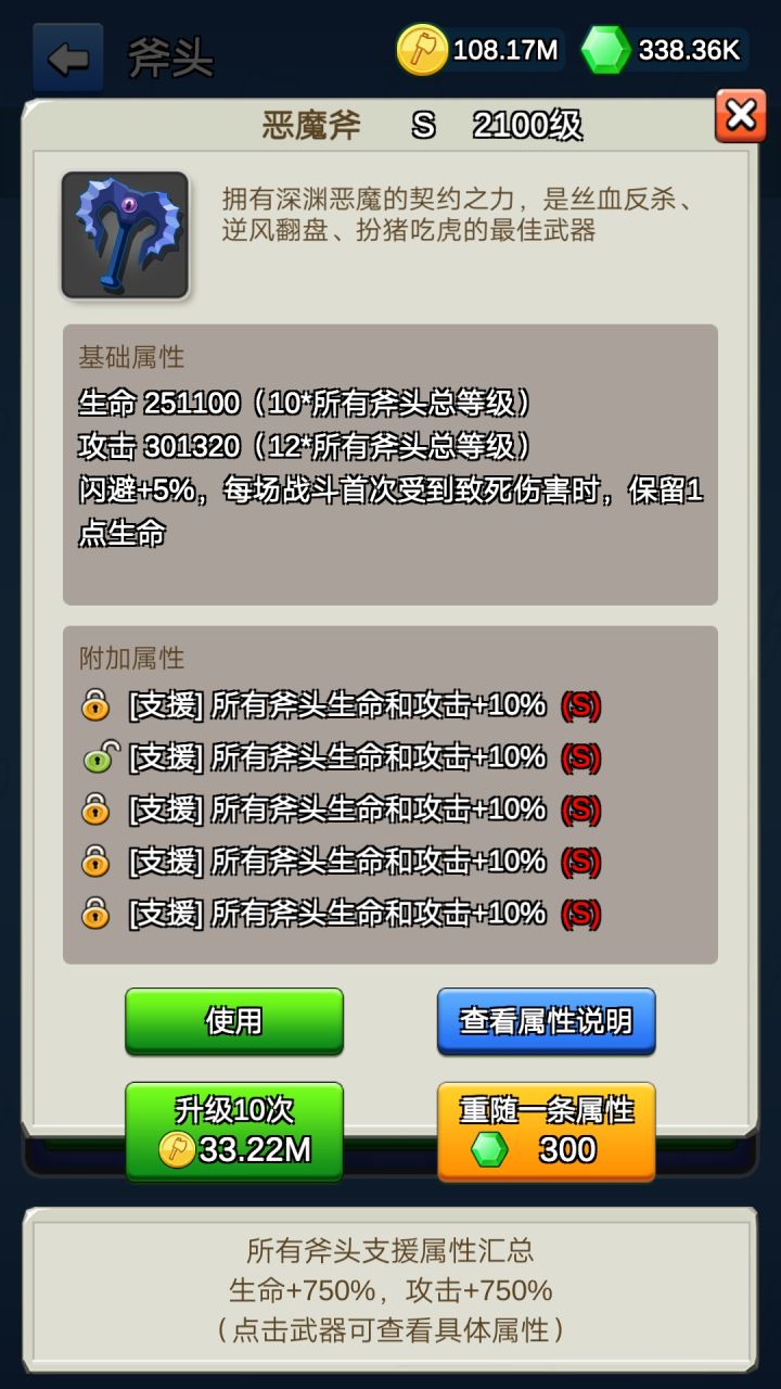 游戏300关后可以洗练斧子2S属性,除你使用的斧子以外,其他的可以洗练支援技能,300关之前是每个斧子每条属性加全斧子攻击血量10%,300关后是每条属性加攻击血量20%,所以建议用的斧子洗匹配它的属性,其他的洗最高级支援属性,感谢大家看完,如有大佬发现不对,留言指教,看到必改。