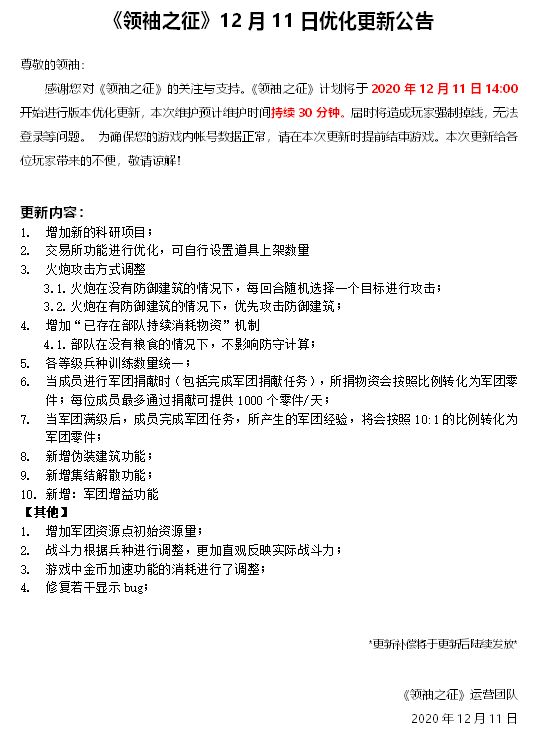 《领袖之征》12月11日优化更新公告