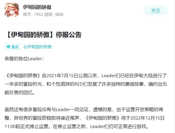 亲爱的各位Leader:《伊甸园的骄傲》自2021年7月15日公测以来,Leader们已经在伊甸大陆进行了一年多的冒险时光,和个性迥异的RED们发展了许多独特的邂逅故事,编织出无数珍贵的回忆。虽然还有很多冒险没有与Leader一同见证,遗憾的是,由于运营开发策略的调整,异世界的冒险旅程即将接近尾声,《伊甸园的骄傲》将于2022年12月15日11:00起正式停止运营。在停止运营之前,Leader