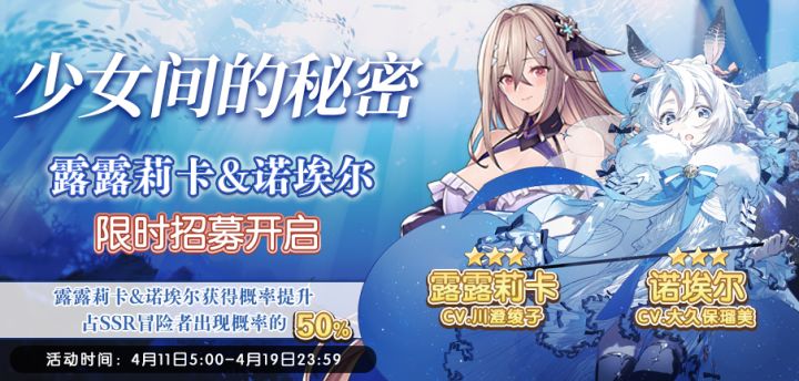 4月11日5:00起#伊甸园的骄傲# 游戏内将开启「少女间的秘密」限时招募,SSR冒险者「露露莉卡」、「诺诶尔」出现概率占SSR冒险者出现概率的50%,欢迎Leader参与招募~活动时间:2022年4月11日5:00~2022年4月19日23:59▼该卡池每次抽卡将获得1点交换pt,累计获得180pt可兑换SSR冒险者「露露莉卡」或「诺诶尔」!