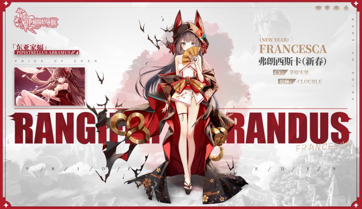 #伊甸园的骄傲# 新冒险者即将登场——【冒险者情报】东亚家蝠(CV: 茅原实里 角色设计: @clouble)✦1月31日10:00起#伊甸园的骄傲# 游戏内将开启【正月 相亲攻防战】限时招募,SSR冒险者「弗朗西斯卡(新春)」出现概率占SSR冒险者出现概率的50%,欢迎Leader参与招募~起止时间:2022年1月31日10:00~2022年2月14日23:59▼该卡池每次抽卡将获得1点