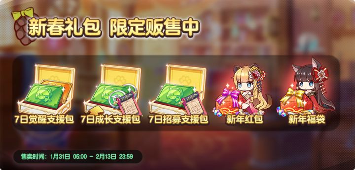 「1/31 5:00」~「2/13 23:59」#伊甸园的骄傲# 游戏内将限时上架新春礼包!◆【7日招募支援包】 售价:128rmb 限购一次购买可立即获得钻石招募券*10,每日可获得钻石招募券*2,共计钻石招募券*24◆【7日觉醒支援包】 售价:68rmb 限购一次购买可立即获得金票*20,每日可获得金票*3,共计金票*41◆【7日成长支援包】 售价:30rmb 限购一次购买可立即获