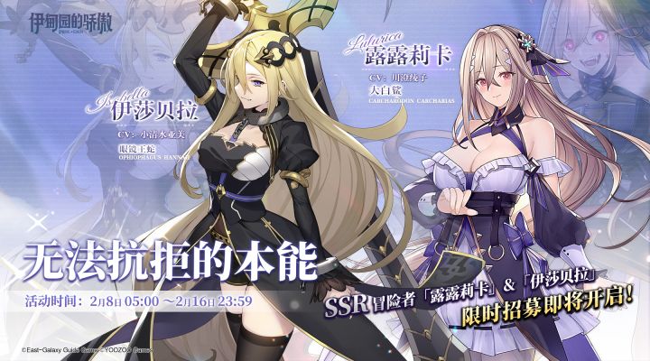 2月8日5:00起#伊甸园的骄傲# 游戏内将开启「无法抗拒的本能」限时招募,SSR冒险者「露露莉卡」、「伊莎贝拉」出现概率占SSR冒险者出现概率的50%,欢迎Leader参与招募~活动时间:2022年2月8日5:00~2022年2月16日23:59▼该卡池每次抽卡将获得1点交换pt,累计获得180pt可兑换SSR冒险者「露露莉卡」或「伊莎贝拉」!