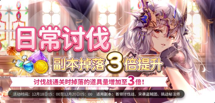 12月18日05:00~12月20日05:00期间,所有「日常讨伐」关卡的掉落道具数量增加至3倍,还请各位Leader不要错过。