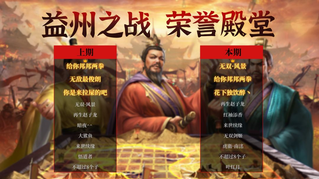 大大们下午好~ 本期“益州之战”圆满落幕,让我们一起来观摩一下第二期益州之战的大佬们吧! 在本期益州之战中荣登TOP10的勇士们依次是:无双·风景、给你邦邦两拳、花下独饮醉丶 再生赵子龙、红袖添香、来世续缘、无双剑姬、虎衛·南洺、不超过8个子、叶红月 目前最高通关难度:困难+10 成功荣登本期益州之战榜首的是 无双·风景 军团,成功攻破 困难+10。 无双·风景 军团武将的配置是: 刘备、张琪瑛、