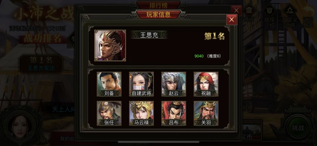 新一期的潼关之战又来咯!恭喜本期上榜的主公大大们! 接下来看看各位大大们的具体分数! 本期战役中前9名的大大都是同一个分数哦~大家都好厉害!ヾ(✿゚▽゚)ノ 温馨提示:分数相同的情况排行榜会按照时间顺序进行排列~ 老规矩,再来看看各位大大们配备的武将吧~ 首先是龍之戰神军团。该军团配备的武将有马超、高览、马云禄、诸葛亮、赵云、吕布、太史慈、黄忠+2个自建。 其次是龍之力量。龍之力量配备的武将有马超