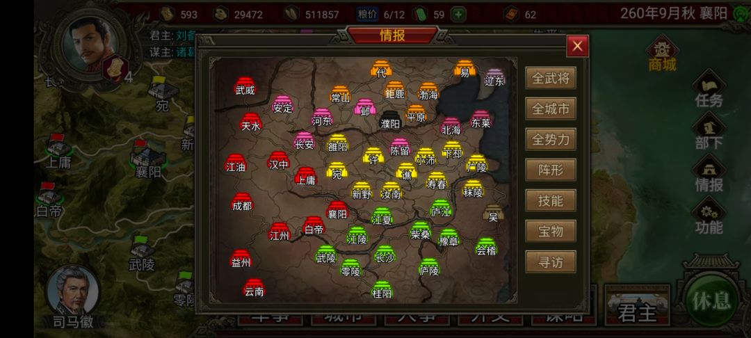 专属守城技能(被动技能,首创诸葛亮)察探不出城池的城防和武将带兵数量,有几率对近战武将(包含4格)产生晕眩,狐疑,效果,该效果持续时长与近战武将智力有关。