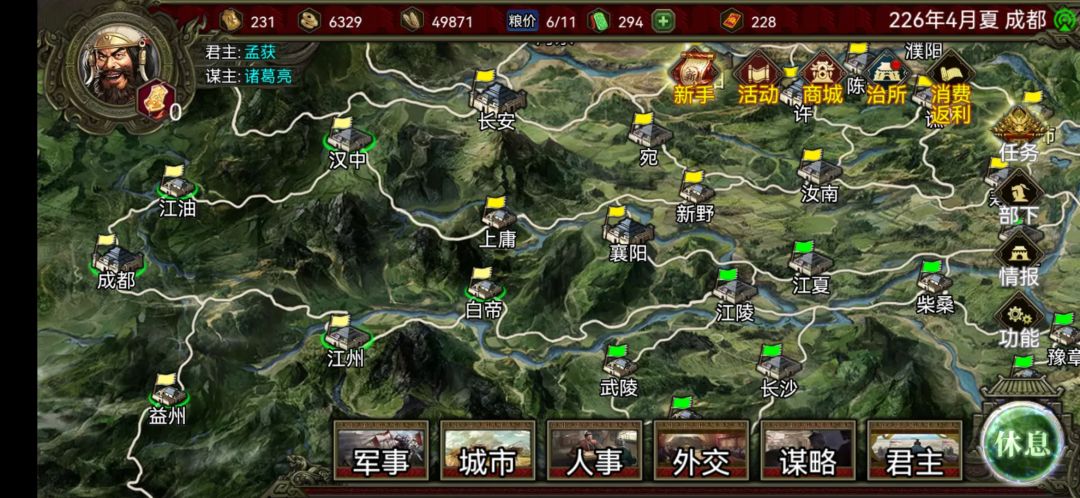 不到一年搞定的孟获 微氪两个武将,一个国色智力90政治80 骑射 回射 雁阵 四个带驰射马。一个智力99 政治80的武将圆阵 奇袭 混乱 回射的自建武将,开局把兵都掉到益州。智力99的圆阵20000兵,祝融和小花带援射把把兵带满 剩下的给带国色的武将。打法智将进林,先晕,然后小花射,然后祝融射,最后带国色的打,射手不进树林。先打成都,带回射的打城时让他在电脑守城攻击范围内。拿下成都后存档,刷粮食和
