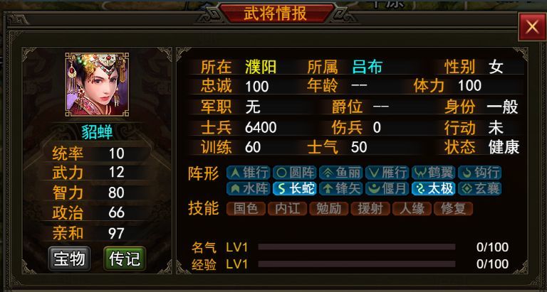 貂蝉,《三国演义》中的任务,在民间传说中,其名为任红昌。是古代四大美女之一。为了报答义父王允的养育之恩而甘愿献身完成连环计,使得董卓被吕布诛杀。据《后汉书》就在,吕布曾与董卓的侍女斯通,这应该就是貂蝉的原型。 貂蝉最常用的使用就是辅助,以及最后的战场补刀(补刀后面会讲到)。 (初始属性) (极限培养) 宝物:无 阵形: 长蛇阵(1阶)、太极阵(1阶) 技能: ●国色:击溃敌军,可抓获部分伤病。 ●