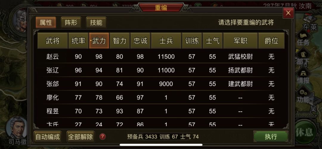 群雄独家干货~评论区每日一更~ 1.征兵:征兵表面只有亲和属性有关,亲和越高征兵越多,实际上除了亲和,武力统帅也影响预备兵的士气和训练,所以如果你有赵云、关羽之类“三高”的武将才是性价比最高的(有募集另算) 图一是赵云征得兵 图二是荀彧征得兵(请忽略兵力,荀彧自带募集)