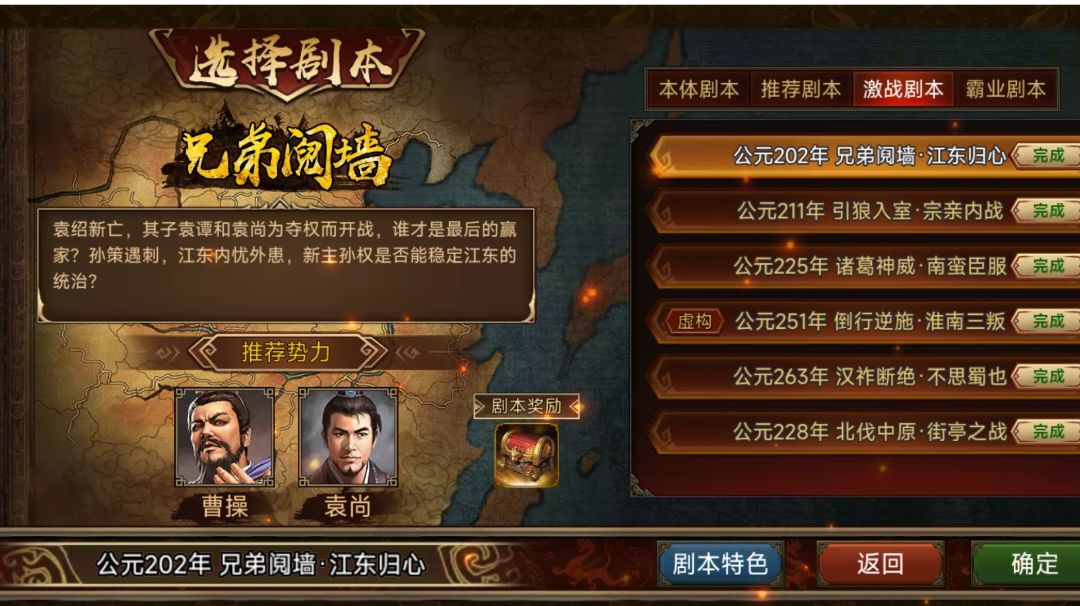 前言:前两三天逛论坛发现还有一些朋友过不了这个剧本或者说遇到了一些麻烦不知道如何破解过关,今天我就围绕着这个话题来简单明了的出个攻略帮助新手玩家快速通关成长。 准备:这个剧本是可以用两名自建武将。个人推荐两名女武将智力99/武力90(95)剩余全加亲和。技能分别为骑射、神臂、混乱、奇袭、国色、疾行。阵型:雁行、圆阵(太极)。 明确任务目的 进入游戏我们会发现时间为225年5月。而游戏机制为每年7月