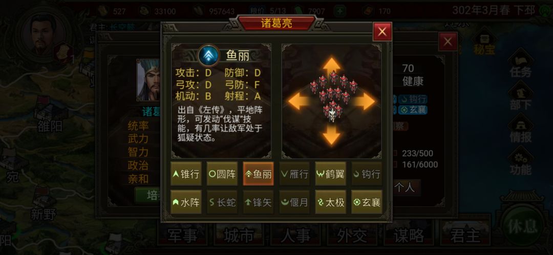 第二张图是产出型武将为了前期获得更多的资源而诞生,口才主要是为了前期结盟,理财前期获得更多钱恭检内政反钱可以叠加,勉励战场获得经验名气值更多可以叠加也是神技,布阵治军纯粹的辅助唯一的输出是阵型自带的伐谋,最主要的是前期能当军师带两万兵!由于是辅助鱼丽是平地阵型,所以需要一个跑得快的山地阵型支援
