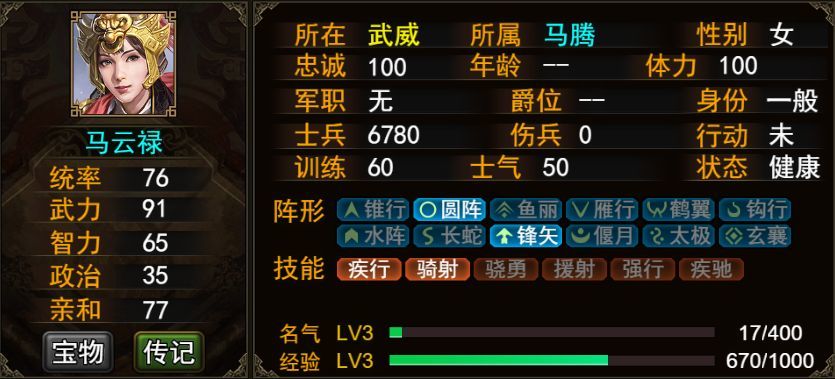 马云禄,小说《反三国演义》中的人物,马腾之女,马超之妹,赵云之妻。品貌超群,武艺出众。 马云禄的基础属性非常值得培养。技能自带骁勇和疾驰,也就说云妹可以朝着单挑的方向培养。 基础属性:阵形:圆阵、锋矢阵 自带技能: 骁勇、疾行、骑射、援射、强行、疾驰 ★属性培养马云禄主要培养两个属性:统率和武力 培养顺序如下: 统率:76→96 第一次:中级统率X1,灵光一闪取最大值→84 第二次:高级统率X1,