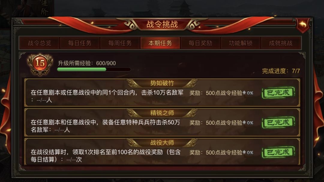 本帖仅为了帮助新手玩家和不知道怎么快速完成任务的朋友们,经常在新手群看见很多人在问通关攻略的,本来早该写了也说不清什么原因就耽搁到了今天才动笔……话不多说,进入主题,明确任务目标,如图: 任务要求需要我们在一回合内击杀10万敌军。怎么击杀呢?…… 推荐:霸业剧本 “黄巾崛起之战” 因为此剧本张角三兄弟都自带“黄天”,我们正是要利用黄天的aoe伤害在一回合内击杀掉十万敌军从而轻松快速的来完成任