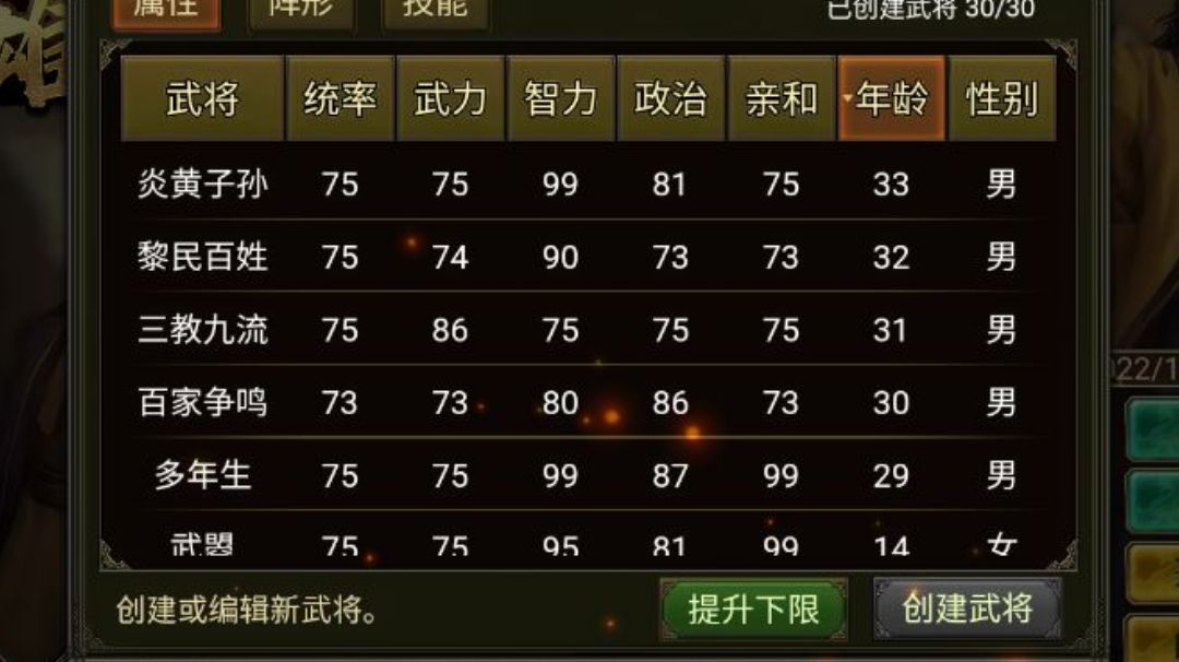 部分剧本会限制自建武将开场使用数量,如大乱斗剧本、激战剧本。而我属于对自建武将比较有执念的人,自己建的人,总得想办法自己用才是…于是经过研究,发现可以通过“套娃+开局sl”的方式,在一开始的几回合内获得大多数主力自建武将。算是一种另类玩法吧,有兴趣可以看看! 该技巧在激战剧本中,开局只要有耐心,几乎能获得全部自建武将。 第一步:设定套娃。 只要年龄适合,每个自建男武将可以设定另外5个不论性别的自建