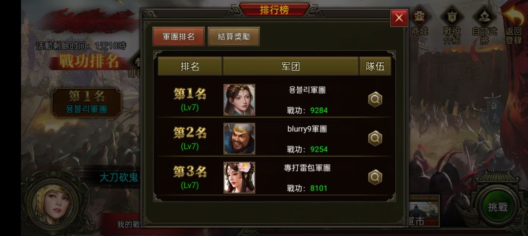 为本期上榜的各位主公大大撒花(´▽`ʃ♡ƪ) 接下来看一下各位大大的具体分数! 长期蝉联战役冠军的龍之戰神军团依旧稳定发挥,在本次合肥之战的首日即达到了巅峰! 龍之戰神军团配备的武将有:张辽、孙尚香、陈到、高览、诸葛亮、马云禄、吕布、赵云 第二位的龙之零九依旧稳健,一同出征的还有张辽、马云禄、张郃、赵云、陈到、诸葛亮、吕布和一位自建武将。 本次位列第三的也是近期战役的新兴之秀“我又是谁的青春”军团