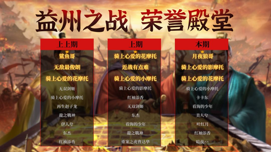 大大们下午好~ 本期“益州之战”圆满落幕,让我们一起来膜拜一下本期益州之战的大佬们吧! 在本期益州之战中荣登TOP10的勇士们依次是:月影狼哥、骑上心爱的影摩托、骑上心爱的花摩托 骑上心爱的小摩托、卡卡东、看海的少年、美人兮、叶红月、红袖添香、暗夜^^ 其中,月夜狼歌、骑上心爱的影摩托、骑上心爱的花摩托、骑上心爱的小摩托 军团以 15574 的战功,成功达成益州之战最高战功,拿下TOP4的殊荣,恭