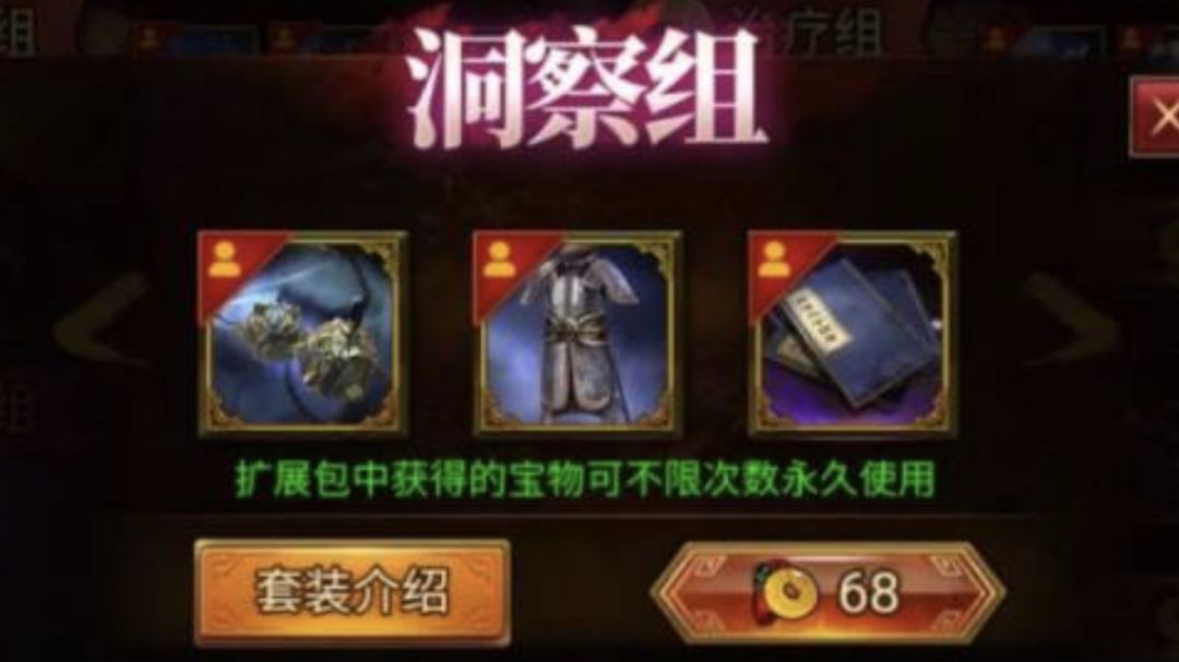 微克的选择。 性价比最高的宝物组,感觉是女色组。。 既有国色,又有援射,一套装备提供了两个稀有又实用的技能。。配合自建两个国色弓,微克也能应付绝大部分剧本和战役了。 不买连珠是因为战役可以抽出吕布黄忠太史慈,连珠是够用的。而且自建奇袭混乱也需要体力和回合数,连珠有点浪费,不如援射实用。。 如果再克一些,可以再买个援射组和单挑组。。单挑组可以给关羽和黄忠实现叱咤加骁勇,战役增加两个控制和输出。 当然如果只买一套装备,建议大家买女色组。
