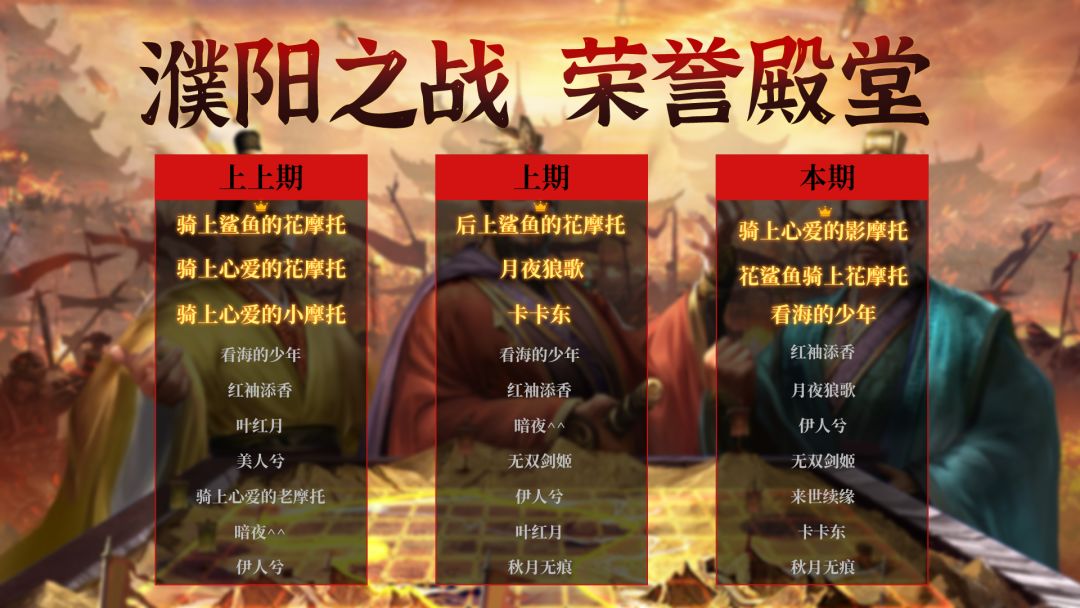 大大们下午好~ 本期战役“濮阳之战”顺利结束,下面让我们来一起膜拜一下英勇将士们吧! 在本次濮阳之战中荣登TOP10的勇士们依次是:骑上心爱的影摩托、花鲨鱼骑上花摩托、看海的少年 红袖添香、月夜狼歌、伊人兮、无双剑姬、来世续缘、卡卡东、秋月无痕 在本次濮阳之战中拔得头筹的是 骑上心爱的影摩托 军团,以 15602 的战功成功攻破 困难+10! 骑上心爱的影摩托 军团武将的配置是: 吕布、孙尚香、张