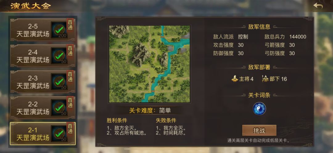 天罡篇难度较低,敌军兵力也不太多,与每周战役简单难度相近。 关于老玩家快速跳关大家应该很熟悉了,简单再列一下备查:1-1、2-1、3-1、4-1、4-5,欢度周末,第五层,欢度周末,第六层。[表情_尬笑] 【2-1】 敌军主将4、部下16,流派控制,总兵力144000,攻击30、防御30、弓攻30、弓防30。 词条:迷阵,兵书学习阵型适应地形时受到伤害降低3%。 出生地:左上。 开局余60天:右上