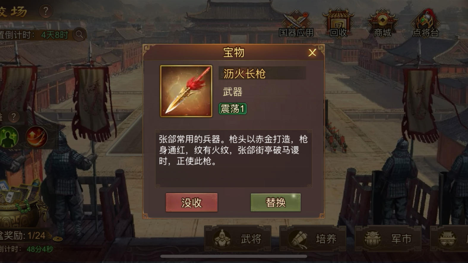 发现个bug,金秋庆典上兑换的沥火长枪,被我拆成震荡技能给张郃装上了,校场装备的时候还是可以装备上。 #群雄时代