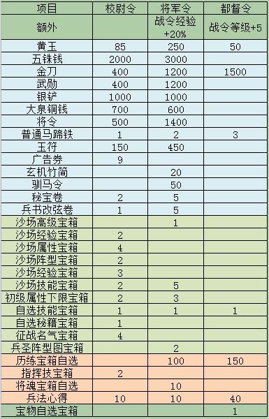 总体很值,任务还是要做。性价比推荐将军令一是新增了资源种类。核心的点一下:秘宝卷、兵书改弦卷、竹简。二是校尉令和将军令的资源总量进行了调整,总体都是增加的,校尉令的基础资源有些挪到了将军令。利好新玩家追赶进度。但是校尉武勋砍得有点多。三是箱子有所压减。别的箱子还好,自选秘籍宝箱减少有点多。这个关乎校场培养保留,好在是培养后就可以提取了。新人先不要乱用