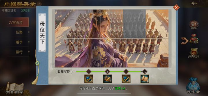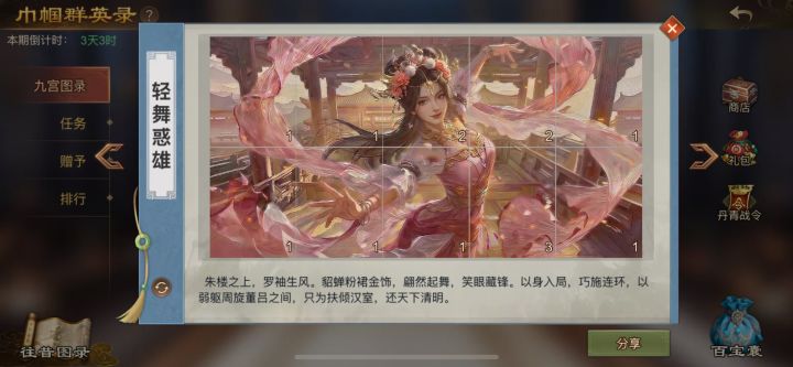 缺母仪1、6、8、10,轻舞3、6、10,塞外2、3,弓腰3,花颜5、。 有的看上图。 来自TapTap[ID:674852328 雷羅]