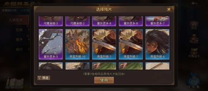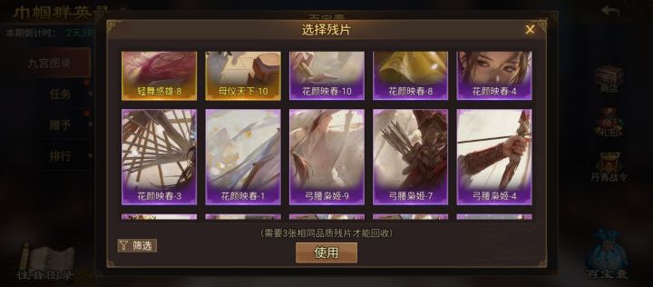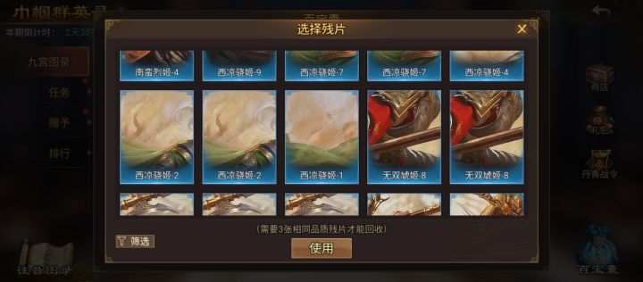 FRG9YN661,求紫卡弓姬4,塞外8,橙卡母仪39,轻舞189,蓝卡西凉2。我有多余橙卡轻舞257,母仪4,其他紫卡有要的留言,我找找看。