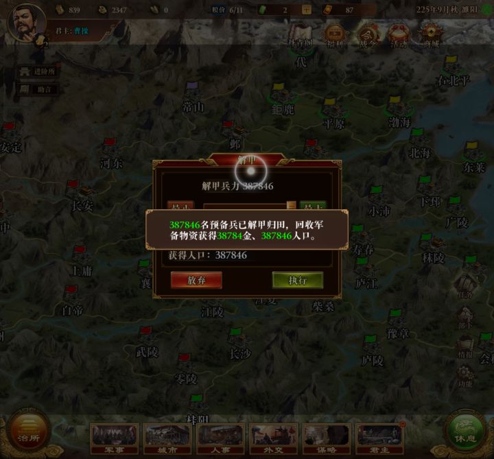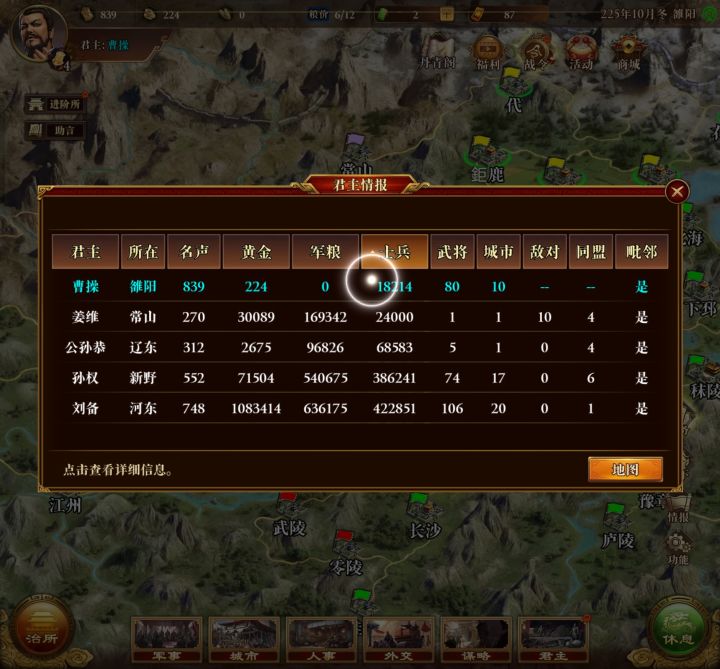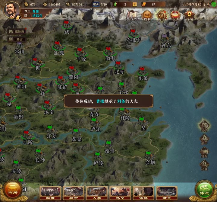 225年,曹操变卖了军粮,让军队解甲归田,然后向刘备陆陆续续进献了一百万两黄金,直至倾家荡产,然后把剩下的城池都割让给刘备,抛家弃子,一个人跑到了东莱。刘备接管了关中、河南、河北,籍吏民,封府库,连曹操的三个孩子也收归自己抚养。嫉妒的孙权率领吴军一路杀到北海,想抢走曹操。刘备立即率大军击败了吴军,收复北海,并来到东莱,派夏侯惇招募曹操,礼遇有加。曹操回到洛阳,立马发动政变,囚禁了刘备及核心亲