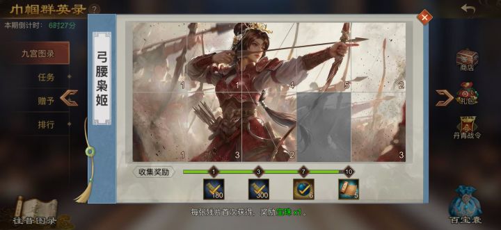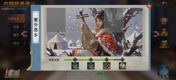 缺母仪1、8、10,轻舞3、6,塞外3、4。有的如图。 来自TapTap[ID:674852328 雷羅]
