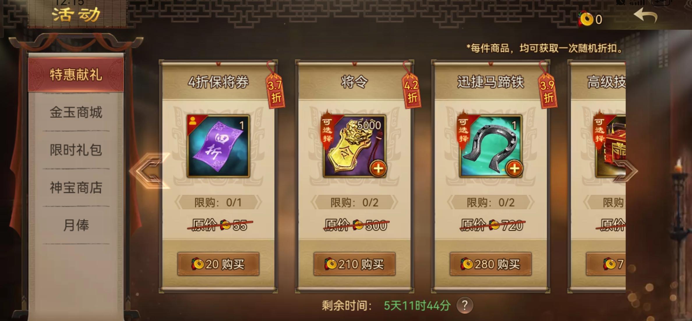 迅捷马蹄铁只要280金玉,以前要累充198金玉才送的东西,现在史无前例3.9折只要280元人民币!装上它就能让我们的马多跑一格,必买!将令居然也可以4折买到了,210人民币就能买5000将令,2万将令就能训满一个特种兵只需840元。对比累充送的将印性价比真的太高了。新年开始,之前常驻的垃圾累充活动终于没有了!明码标价,童叟无欺!早该这么干了,之前充值799金玉才送一个垃圾神宝和一大堆金刀武勋驯