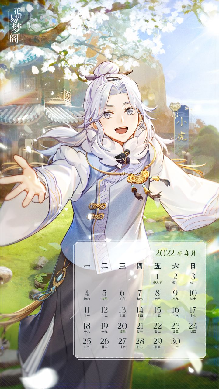 畅爽的春风带来了温柔的四月,可爱的小虎为你奉上精致的月历!(~ ̄▽ ̄)~温馨提示,今天虽然是愚人节,不过玩笑也要适度哦~※4月7日从评论区随机抽出2位幸运易梦师大大送出“《花开易梦阁》人物徽章”一套(4个)!想知道如何入职易梦阁?想学习强大的易梦之术?赶紧动动手,点击关注和预约吧!预约传送门:解锁更多记忆和福利,欢迎各位易梦师加入官方QQ交流群:①群:710641314(满员)②群: