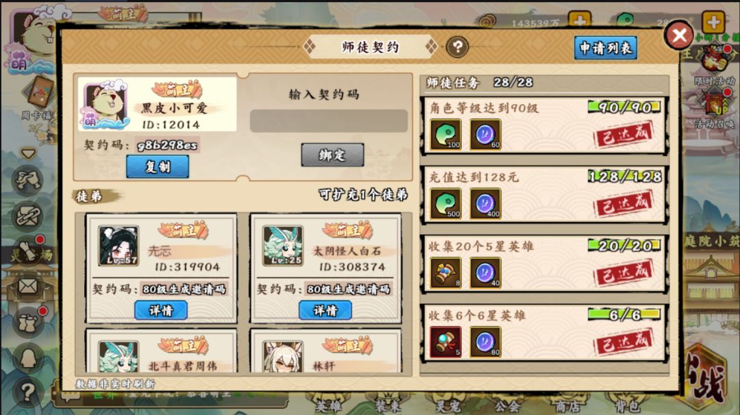亲爱的老铁们: 你知道《无双萌将》里有一个功能叫#师徒契约#吗?就是如果你是一个新人,你还在80级之前并且刚进游戏不满一周的话,你可以找一个带你的师傅,这个师傅可以带着你一起领奖励;如果你是轮回道的老司机,你可以每15天契约一个徒弟,不管徒弟是在辛苦爬塔,还是云游他方,到了15天你的徒弟孝敬礼都会自动发给你!那么亲爱的老铁们,来和我们一起说说你和你徒弟或者是你和你师傅的无双故事吧,在火热的新年里,