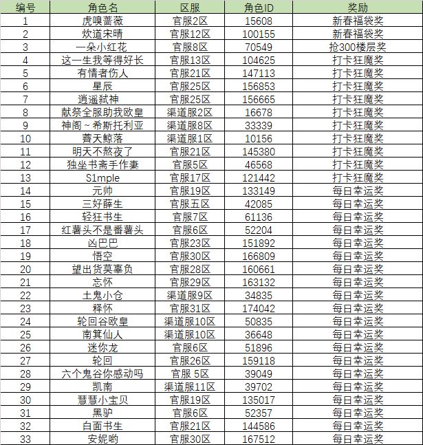 感谢各位萌主的积极参与, 非常开心大家能在春节期间一直打卡分享自己的游戏体验,你们的热情真的让三师弟非常感动。 活动地址: 我们从所有参加的萌主中抽出了一些幸运儿,一起来看看都有谁吧~ 【活动奖励】 抢楼666奖:勾玉*666 新年福袋奖:勾玉*200、召唤卷轴*8 打卡狂魔奖:勾玉*888、召唤卷轴*20、御灵卷轴*8 每日幸运奖:勾玉*288 【奖励方式】 2月20日进行统计,2月22日开奖并