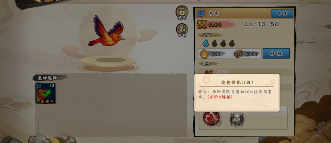 仙鹤B级是朱雀,一只小小鸟,技能B级50级解锁,增加10%的技能伤害。 凤凰进阶是暴击伤害流必备宠物,一刀999不是梦想。 巨鲲进阶是反击降暴击流必备宠物,减伤免控太强了。 麒麟进阶更适合打刺客快攻,暴击流第二推荐。为什么推荐暴击流,因为当暴击流遇到钟无艳大乔鬼谷子这样的克制队伍,带了凤凰暴击也很难打出来,这时候就需要湮灭增伤并且加速打,欧皇附体打出暴击更是附带了湮灭伤害。所以宠物选择困难症的选着