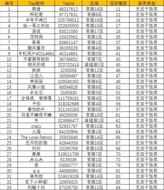 亲爱的萌主, 感谢诸位萌主的踊跃参与,元旦抽取守护英雄活动已经落幕,本次活动获奖的萌主名单如下: 【幸运奖】 【干饭奖】 本次活动奖励如下: 幸运奖(5名):勾玉*1888+无双纪念手办(实体); 干饭奖(未获得幸运奖且符合要求的干饭人):勾玉*1888+召唤卷轴*20; 奖励将会在今日内(2023-1-3)通过邮件发放给获奖的萌主。 获得幸运奖的小伙伴请带上活动名称和获奖截图,在无双QQ群内寻找